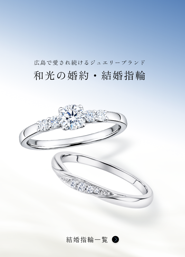 1953年創業以来50万人の方々に愛され続けるジュエリーブランドWAKOが贈る、ブライダルリング専門店「WAKO BRIDAL」。広島で婚約指輪(エンゲージリング)・結婚指輪(マリッジリング)を多数取り揃えるWAKO BRIDALは、広島初となる工房併設型のブライダルジュエリー専門店としてオープンしました。価値あるダイヤモンドを適切な価格で提供することにこだわった婚約指輪と100種類以上のデザインから選べる結婚指輪は、お客様のお好みに合わせて選べるように多彩なバリエーションをご用意しております。その他、デザイナー・職人・鑑定士とプロフェッショナル達が常駐しており、お客様のご希望を伺いながら切な指輪選びのお手伝いをいたします。