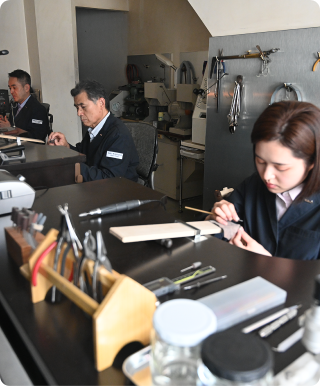 繊細な設計と判断が求められる工程は、国家資格を持つ貴金属装身具製作技能士が担当します。
