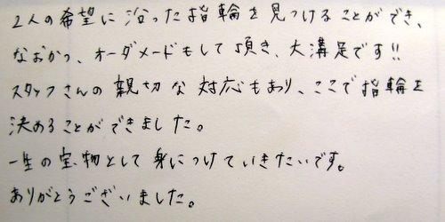 二人の希望に沿った指輪を見つけることができ、 なおかつ、オーダーメードもして頂き、大満足です!!スタッフさんの親切な対応もあり、ここで 指輪を決めることだできました。一生の宝物として身につけていきたいです。ありがとうございました。