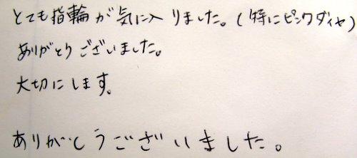 彼女:とても指輪が気に入りました。(特にピンクダイヤ)ありがとうございました。大切にします。