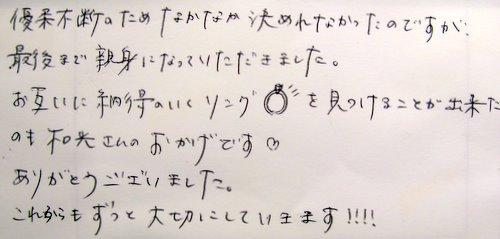 優柔不断のためなかなか決められなかったのですが、 最後まで親身になっていただきました。 お互いの納得のいくリングを見つけることが出来た のも和光さんのおかげです ありがとうございました。 これからもずっと大切にしていきます!!!!