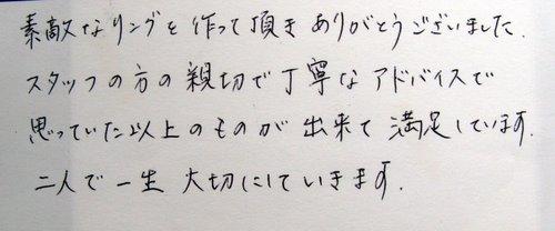 素敵なリングを作って頂きありがとうございました。 スタッフの方の親切で丁寧なアドバイスで思っていた以上のものが出来て満足しています。 二人で一生大切にしていきます。