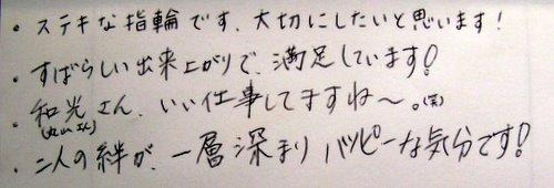 ・ステキな指輪です。大切にしたいと思います。 ・すばらしい出来上がりで、満足しています! ・和光さん(丸山さん)いい仕事してますね~((笑)) ・二人の絆が、一層深まりハッピーな気分です!
