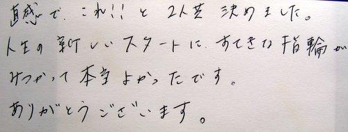 直感でこれ!!と二人共決めました。人生の新しいスタートにすてきな指輪がみつかって本当に良かったです。ありがとうございました。
