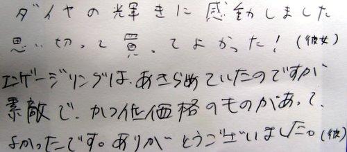 彼:エンゲージリングはあきらめていたのですが、素敵で、かつ低価格のものがあって、よかったです。ありがとうございました。