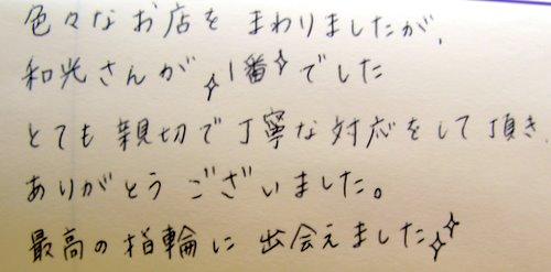色々なお店をまわりましたが、和光さんが ☆1番☆でした。とても親切で丁寧な対応 をして頂きありがとうございました。 最高の指輪に出会えました。