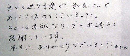 色々と迷う予定が、和光さんであっさり決めてしまいました。 その位素敵なリングと出逢えて感謝しています。 本当に、ありがとうございました☆☆☆