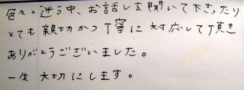 色々迷う中、お話しを聞いて下さったり とても親切かつ丁寧に対応して頂きありがとうございました。一生大切にします。