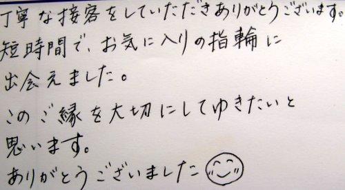 丁寧な接客をしていただきありがとうございます。短時間で、お気に入りの指輪に出会えました。 このご縁を大切にしてゆきたいと思います。 ありがとうございました(*^_^*)
