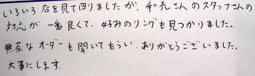 いろいろ店を見て回りましたが、和光さんのスタッフさんの対応が一番良くて、好みのリングが見つかりました。無茶なオーダーも聞いてもらい、ありがとうございました。大事にします。