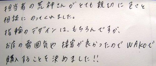 担当者の荒神さんがとても親切に色々と相談にのってくれました。指輪のデザインは、もちろんですが、お店の雰囲気や接客が良かったのでWAKOで購入することを決めました!! (ご購入/お引渡し)2010年12月~12月 しんさん&ちあきさん