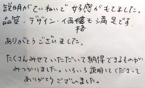 ・接客がていねいで好感がもてました。品質・デザイン・価格も満足です。ありがとうございました。