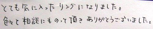 とても気に入ったリングになりました。色々と 相談にものって頂きありがとうございました。