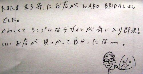 たまたま立ち寄ったお店が WAKO BRIDALさんでした。かわいくてシンプルなデザインが気に入り即決!いいお店が見つかって良かったな~。 ※イラスト付き (*^_^*)(*^_^*)