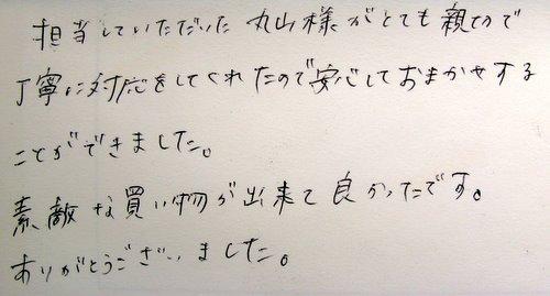担当していただいた丸山様がとても親切で丁寧に対応してくれたので 安心しておまかせすることができました。 素敵な買い物が出来て良かったです。 ありがとうございました。