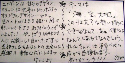 ・エンゲージは好みのデザイン、マリッジは世界にひとつだけのオリジナルデザイン‥?色々とわがままを細かく聞いて形にして下さり、ありがとうございました!やっぱりWAKOさんにお願いして良かったです(^_-)荒神さん&丸山さんとの出会いに感謝!!素敵な式にします? →けいこより