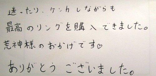 迷ったり、ケンカしながらも最高のリングを購入できました。荒神さんのおかげです? ありがとうございました。