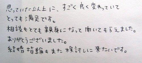 思っていた以上に、すごく良く変わっていてとっても満足です。 相談もとても親身になって聞いてもらえました。 ありがとうございました。 結婚指輪もまた検討しに来たいです。