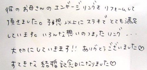 彼のお母さんのエンゲージリングをリフォームして 頂きました。予想以上にステキでとても満足して います。いろんな想いのつまったリング・・・。 大切にしていきます!!ありがとうございました? すてきな結婚記念日になりました?