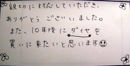 親切に対応していただき、ありがとうございました。また、10年後にダイヤを買いに来たいと思います(*^_^*)