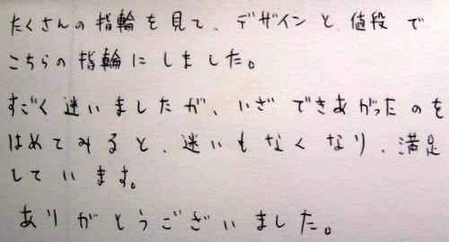 たくさんの指輪を見て、デザインと値段でこちらの指輪にしました。すごく迷いましたが、いざできあがったものをはめると、迷いもなくなり、満足しています。ありがとうございました。