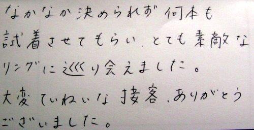 なかなか決められず何本も試着させてもらい、とても素敵なリングに巡り会えました。 大変ていねいな接客、ありがとうございました。