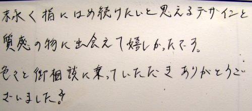 末永く指にはめ続けたいと思えるデザインと 質感の物に出会えて嬉しかったです。 色々と御相談に乗っていただきありがとうございました。