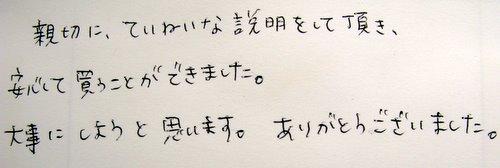 親切に、ていねいな説明をして頂き、安心して 買うことができました。 大事にしようと思います。ありがとうございました。