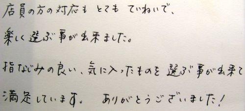店員の方の対応もとてもていねいで、楽しく選ぶ事が出来ました。指なじみの良い、気に入ったものを選ぶ事が出来て満足しています。ありがとうございました!
