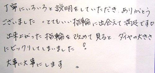 丁寧にいろいろと説明をしていただき、 ありがとうございました。 とてもいい指輪に出会えて満足です? 出来上がった指輪を改めて見ると、 ダイヤの大きさにビックリしてしまいました! 大事に大事にします。