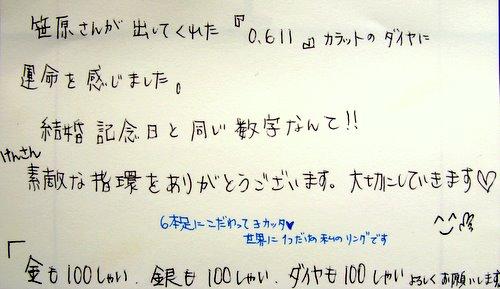 笹原さんが出してくれた『0.611』カラットのダイヤに 運命を感じました。 結婚記念と同じ数字なんて!! <けんさん>素敵な指輪をありがとうございます。 大切にしていきます? 6本足にこだわってヨカッタ? 世界に1つだけの私のリングです(^_^)v 「金も100しゃい、銀も100しゃい、 ダイヤも100しゃい よろしくお願いします」