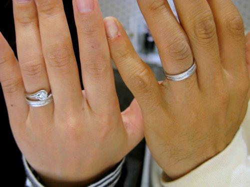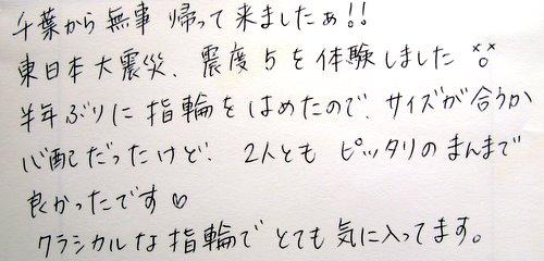 千葉から無事帰って来ましたぁ!! 東日本大震災、震度5を体験しました(*o*) 半年ぶりに指輪をはめたので、サイズが合うか 心配だったけど、2人ともピッタリのまんまで 良かったです? クラシカルな指輪でとても気に入っています。