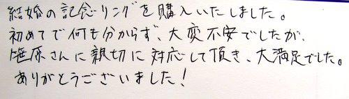 結婚の記念リングを購入いたしました。 初めてで何もわからず、大変不安でしたが、 笹原さんに親切に対応していただき、 大変満足でした。 ありがとうございます!
