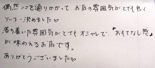偶然ここを通りかかって、お店の雰囲気がとても良く、 ソッコー決めました☆ 落ち着いた雰囲気がとてもオシャレで、『おもてなし感』が 味わえるお店です。 ありがとうございました☆