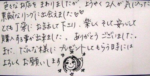 色々なお店をまわりましたが、ようやく2人が気に入った 素敵なリングに出会えました☆☆ とても丁寧にお話して下さり、楽しくそして安心して購入する事が 出来ました。ありがとうございました。 また、だんな様にプレゼントしてもらう時には宜しくお願いします☆ (※イラストつきです♪)