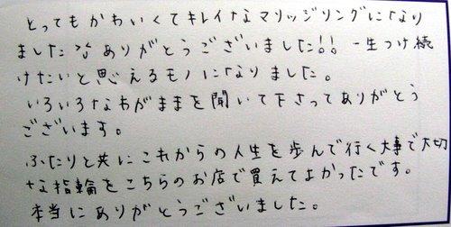 とってもかわいくてキレイなマリッジリングになりました(>_<) ありがとうございました!! 一生つけ続けたいと思えるモノになりました。 いろいろなわがままを聞いて下さってありがとうございます。 ふたりと共にこれからの人生を歩んで行く大事で大切な指輪を こちらのお店で買えてよかったです。 本当にありがとうございました。