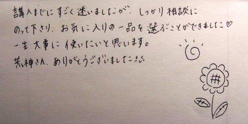 購入までにすごく迷いましたが、しっかり相談にのって下さり、 お気に入りの一品を選ぶことができました♪ 一生大事に使いたいと思います。 荒神さん、ありがとうございました(^_-) (※イラスト付きです♪)