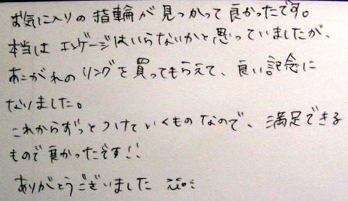 お気に入りの指輪が見つかって良かったです。 本当はエンゲージはいらないかと思っていましたが、 あこがれのリングを買ってもらえて、良い記念になりました。 これからずっとつけていくものなので、満足できるもので 良かったです!! ありがとうございました。