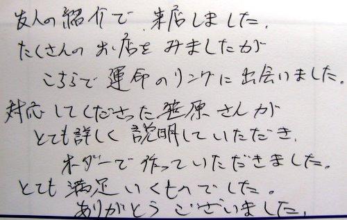 友人の紹介で来店しました。たくさんのお店をみましたが、 こちらで運命のリングに出会いました。 対応してくださった笹原さんが、とても詳しく説明していただき、 オーダーで作っていただきました。 とても満足いくものでした。ありがとうございました。