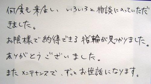 何度も来店し、いろいろと相談にのっていただきました。 お陰様で納得できる指輪が見つかりました。 ありがとうございました。 またメンテナンスで、ずっとお世話になります。