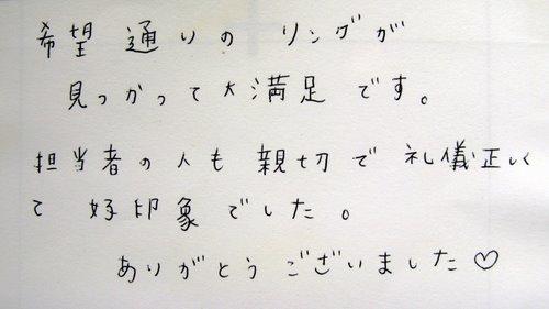 希望通りのリングが見つかって大満足です。 担当者の人も親切で礼儀正しくて好印象でした。 ありがとうございました♪