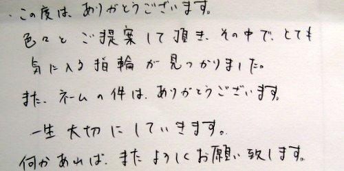 この度は、ありがとうございます。色々とご提案して頂き、 その中でとても気に入る指輪が見つかりました。 また、ネームの件は、ありがとうございました。 一生大切にしていきます。 何かあれば、またよろしくお願い致します。