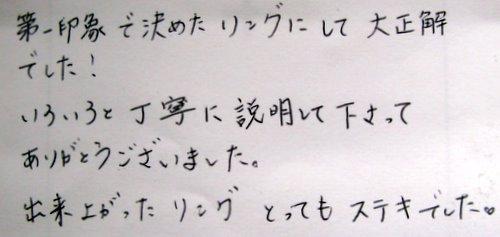 第一印象で決めたリングにして大正解でした! いろいろと丁寧に説明して下さってありがとうございました。出来上がったリングとってもステキでした。