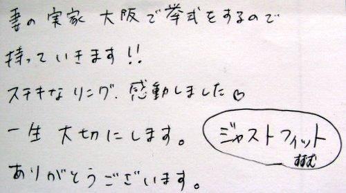 妻の実家、大阪で挙式をするので持っていきます!! ステキなリング感動しました?一生大切にします。 ありがとうございます。