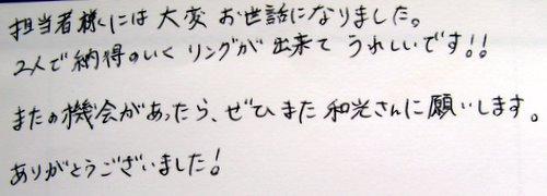 担当者様には大変お世話になりました。 2人で納得のいくリングが出来てうれしいです!! またの機会があったら、ぜひまた和光さんに願いします。 ありがとうございました!