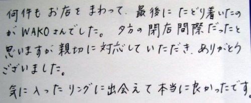 何件もお店をまわって最後にたどり着いたのがWAKOさんでした。夕方の閉店間際だったと思いますが親切に対応していただき、ありがとうございました。 気に入ったリングに出会えて本当に良かったです。