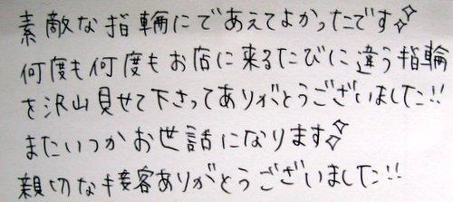 素敵な指輪にであえてよかったです☆ 何度も何度もお店に来るたびに違う指輪を沢山見せて下さってありがとうございました!!またいつかお世話になります☆親切な接客あいがとうございました!!