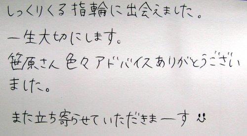 しっくりくる指輪に出会えました。 一生大切にします。 笹原さん色々アドバイスありがとうございました。 また立ち寄らせていただきまーす(スマイルマーク付き)