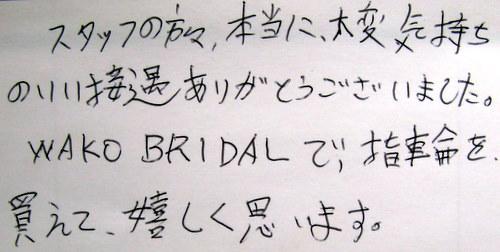 スタッフの方々、本当に大変気持ちのいい接遇 ありがとうございました。 WAKO BRIDALで、指輪を買えて、嬉しく思います。