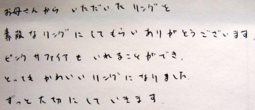 お母さんからいただいたリングを素敵な リングにしてもらいありがとうございます。 ピンクサファイアもいれることができ、 とってもかわいいリングになりました。 ずっと大切にしていきます。